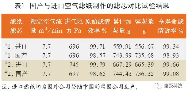 在此,仅以空气滤纸的质量为例,反映国产滤纸与进口滤纸的质量差异。见表1。
